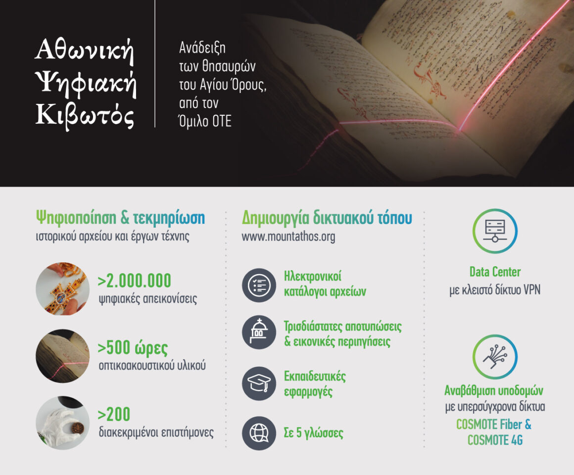 Διαθέσιμοι σε όλους μέσω διαδικτύου είναι πλέον οι θησαυροί του Αγίου όρους, με την υλοποίηση από τον Όμιλο ΟΤΕ του μεγαλύτερου έργου στην Ελλάδα στον τομέα του ψηφιακού πολιτισμού, που ολοκληρώθηκε σε τέσσερα χρόνια. Μέσω της ψηφιοποίησης και τεκμηρίωσης του ιστορικού αρχείου και των έργων τέχνης της Αθωνικής Πολιτείας, περισσότερες από 2 εκατ. ψηφιακές απεικονίσεις εγγράφων, βιβλίων, χειρογράφων και 27 χιλιάδες απεικονίσεις κειμηλίων, καθώς και τρισδιάστατες αποτυπώσεις μνημείων, εικονικές περιηγήσεις μονών και εκπαιδευτικές εφαρμογές, συγκεντρώνονται πλέον στο portal www.mountathos.org, που δίνει τη δυνατότητα σε κοινό και επιστήμονες να εισέλθουν στα άδυτα του ιερού τόπου και να ανακαλύψουν τον σπάνιο πολιτιστικό του πλούτο.